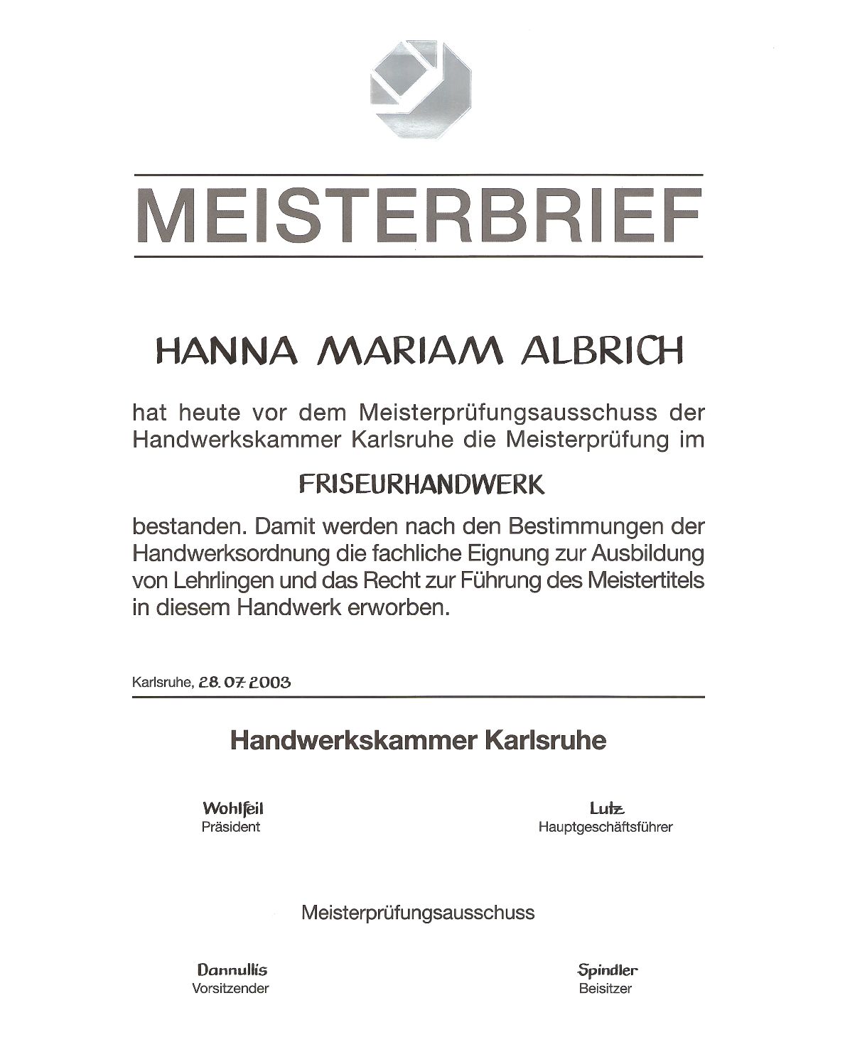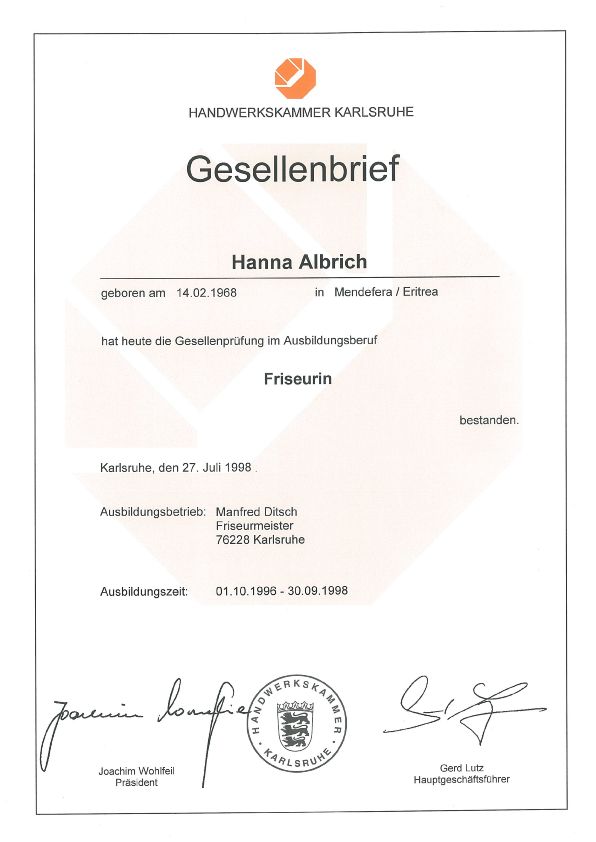 Hanna Mariam Albrich bestand am 27.07.1998 die Gesellenprüfung in Karlsruhe. Den Meisterbrief für das Friseurhandwerk erhielt sie am 28.07.2003.