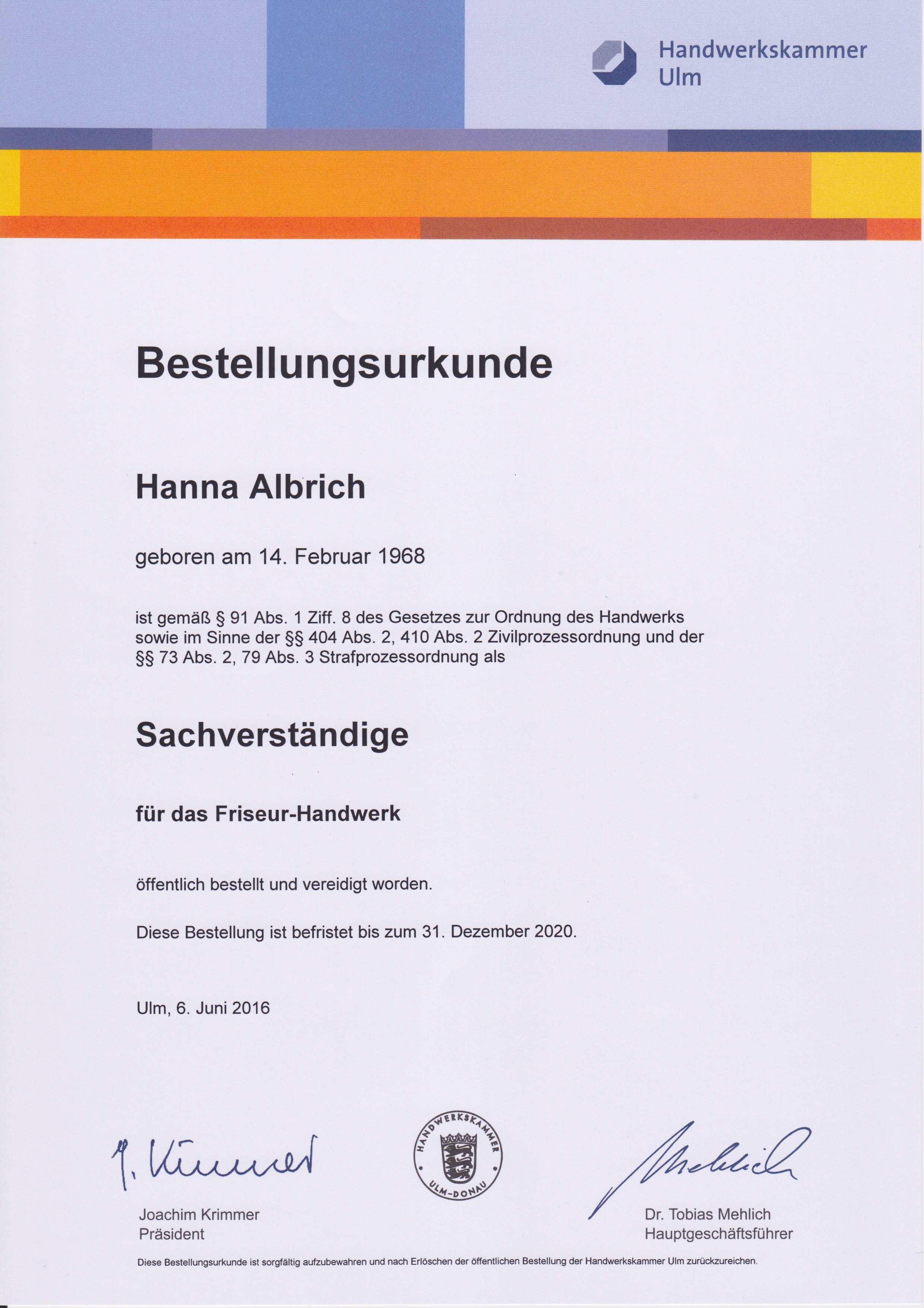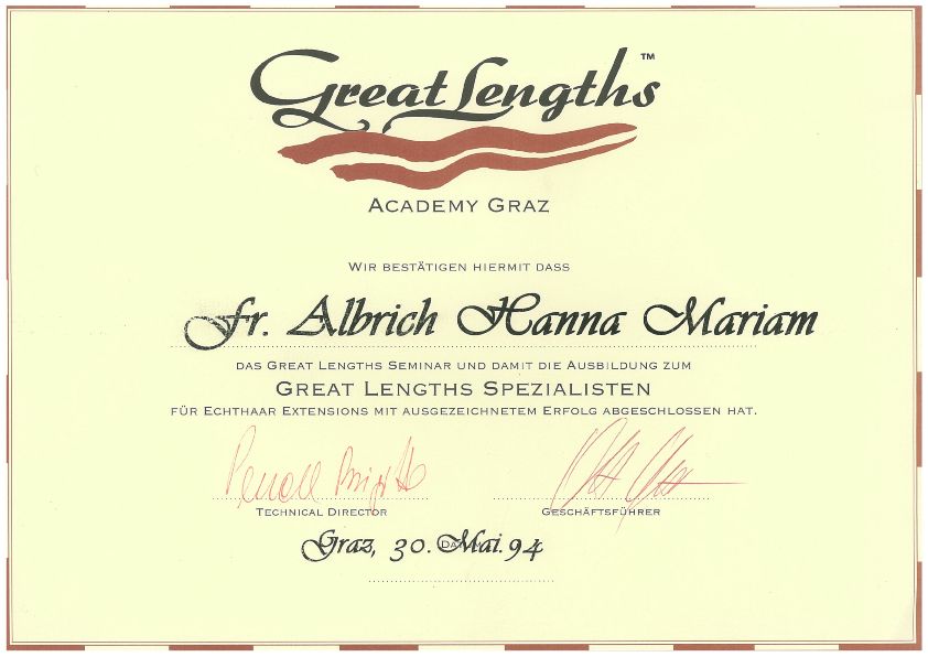 Zu den von Ihr besuchten Weiterbildungen gehören zum Beispiel auch ein Seminar bei Great Lengths in Graz im Jahr 1994. Natürlich ruhte sich die energiegeladene Hanna Albrich nie auf Ihren Lorbeeren aus, was sich darin auszahlt, das sie im Jahr 2006 von der Handwerkskammer in Karlsruhe zur vereidigten Sachverständigen für das Friseurhandwerk ernannt wurde.
